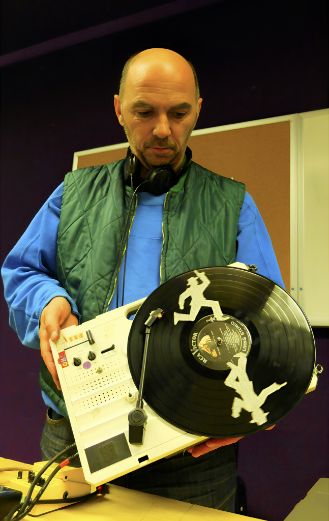 Montreal’s Martin Tétreault is a turntablist, improviser, sound designer, and visual artist who performs on turntables that he has built or adapted himself. He has participated in numerous sound art and media art festivals and events in Quebec and internationally. He has released more than 50 albums on numerous labels. In 2004, he developed a system of musical notation and playing surfaces, creating the Turntable Quartet. In 2015, curator Nicole Gingras published Des disques et un couteau, a monograph documenting his work as a visual artist.